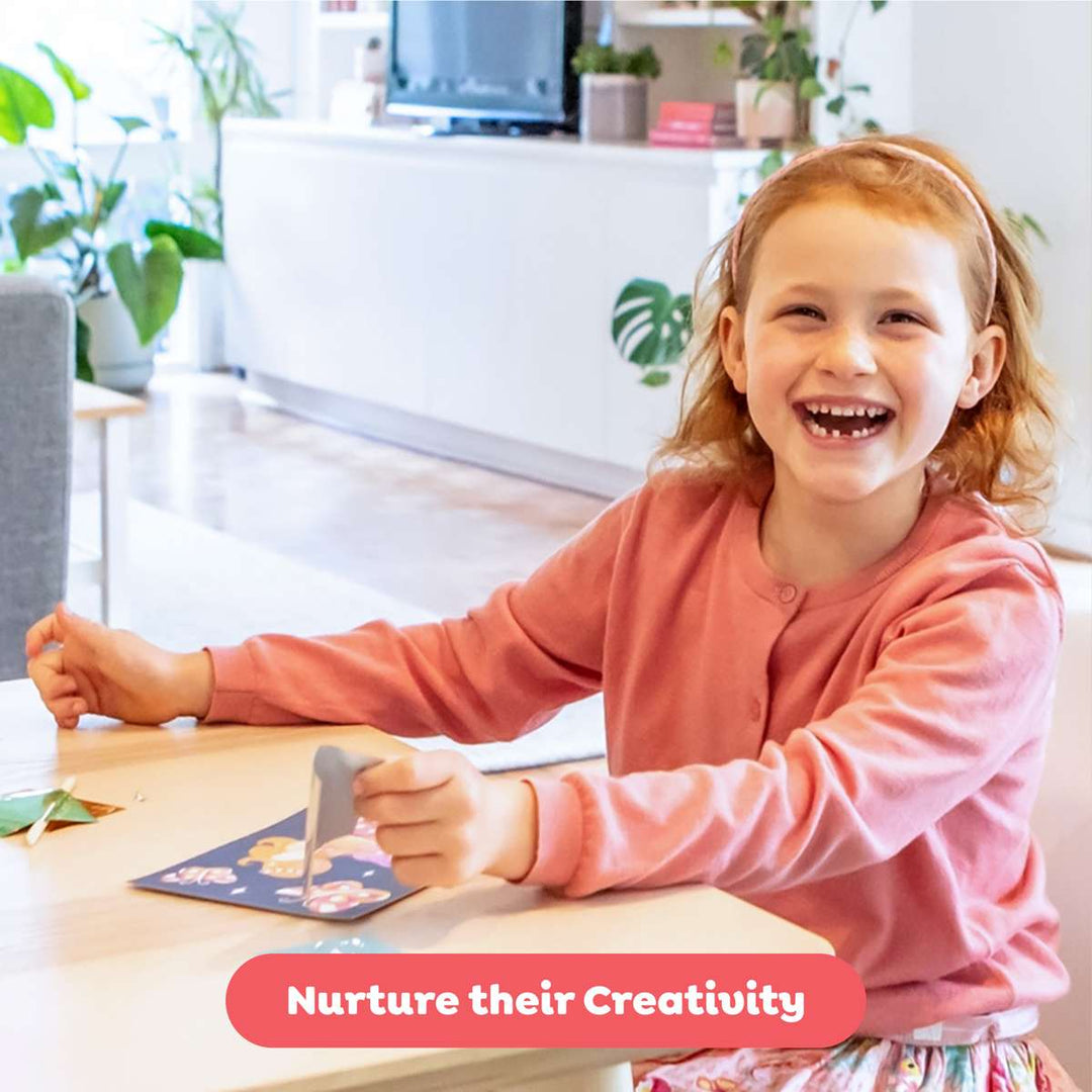 Butterfly wings, flower petals and fairy crowns are all waiting to be brought alive with a sparkling rub of holographic foil! Simply select a colour illustrated fairy card and use the enclosed wooden lifter to peel sections off the picture, revealing adhesive sections. Grab a shimmering foil sheet, rub the foil onto the sticky area and voila! A beautiful shiny artwork.